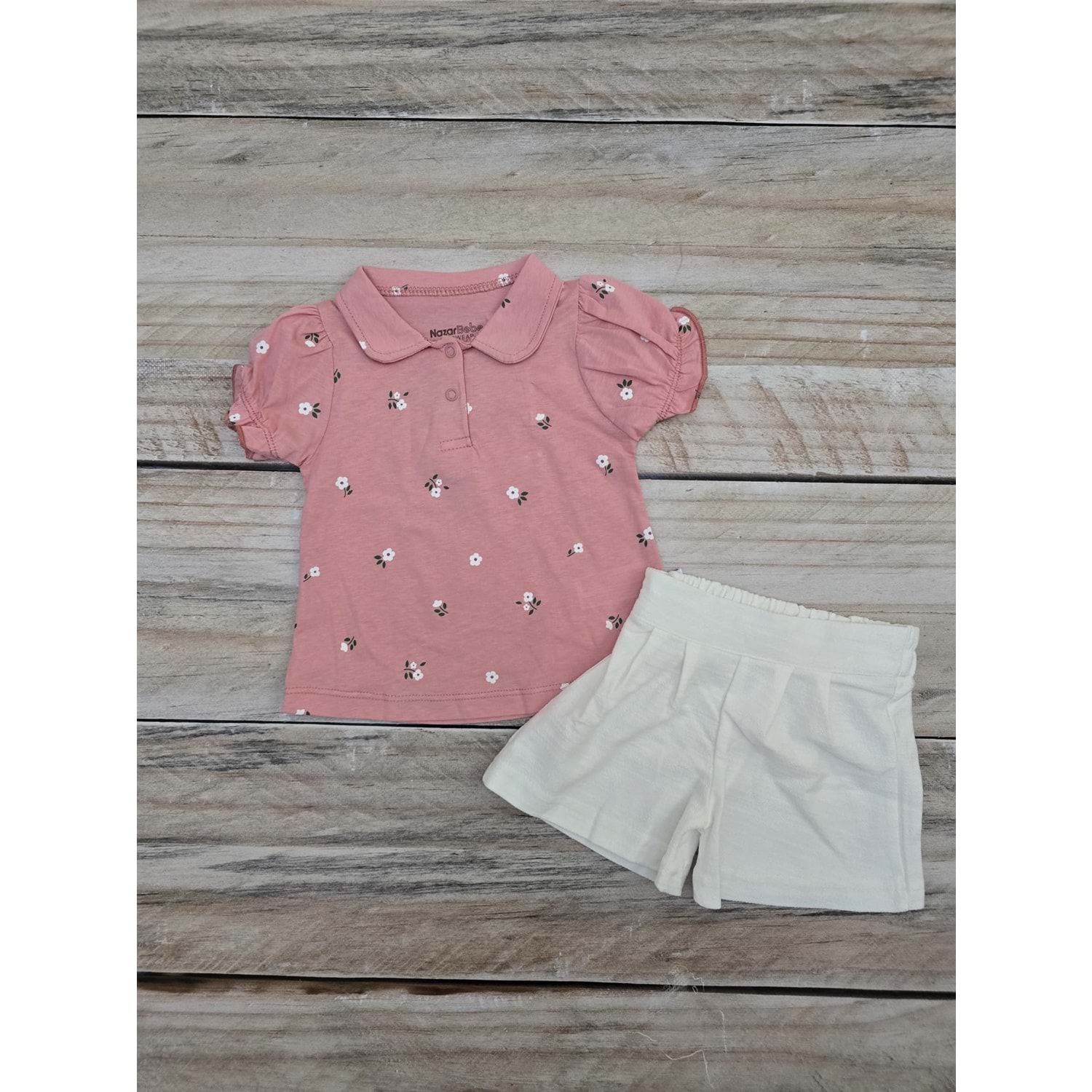 (9-24) Ay NAZAR BEBE ÇİÇEK DESENLİ ŞORTLU TAKIM - PEMBE - 9 AYLIK