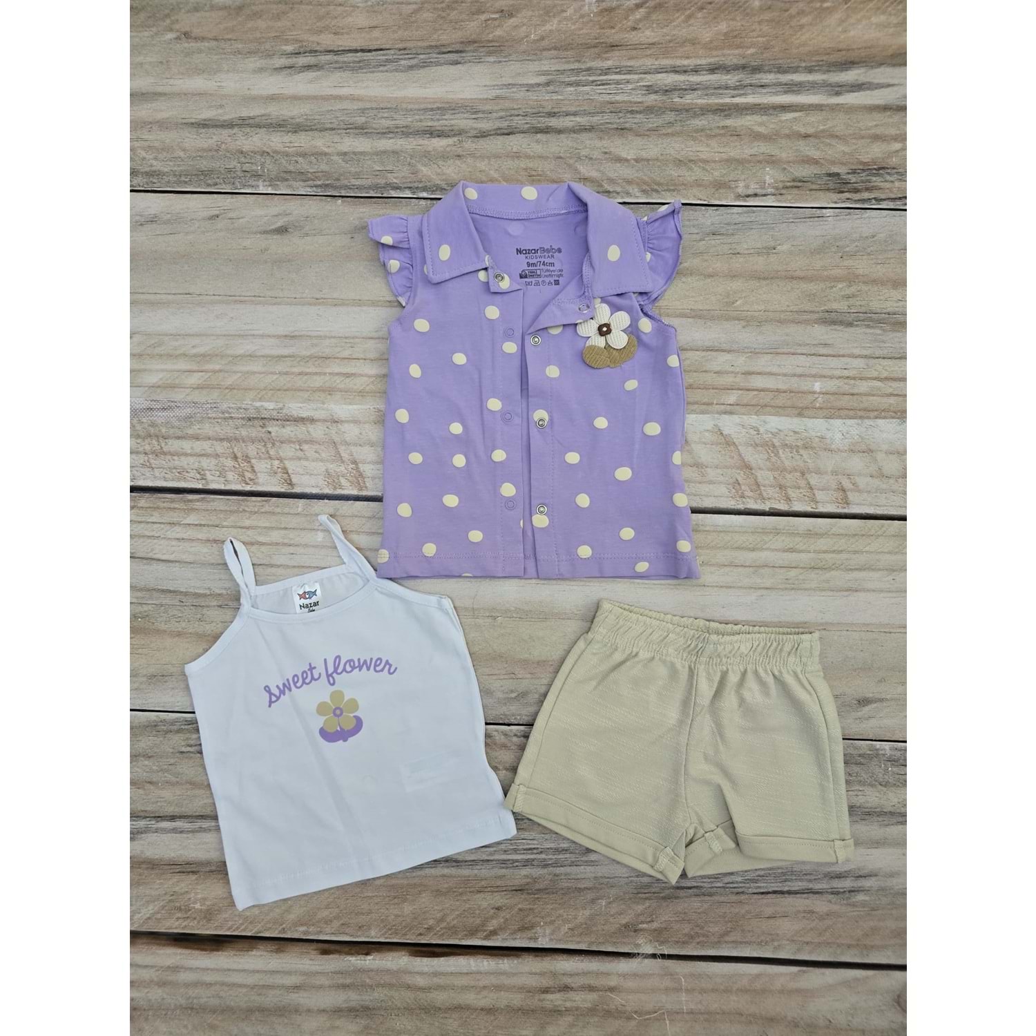 (9-24) Ay NAZAR BEBE PUANTİYELİ ÜÇ PARÇALI ŞORTLU TAKIM - MOR - 9 AYLIK
