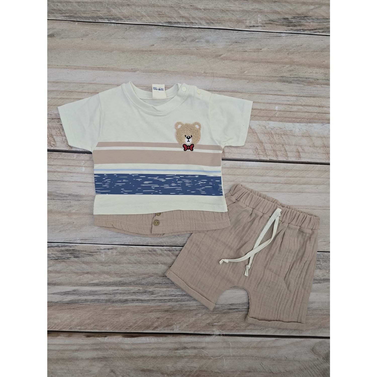 (9-24) Ay WOW DÜĞMELİ AYI DESENLİ ŞORTLU TAKIM - KAHVERENGİ - 9 AYLIK