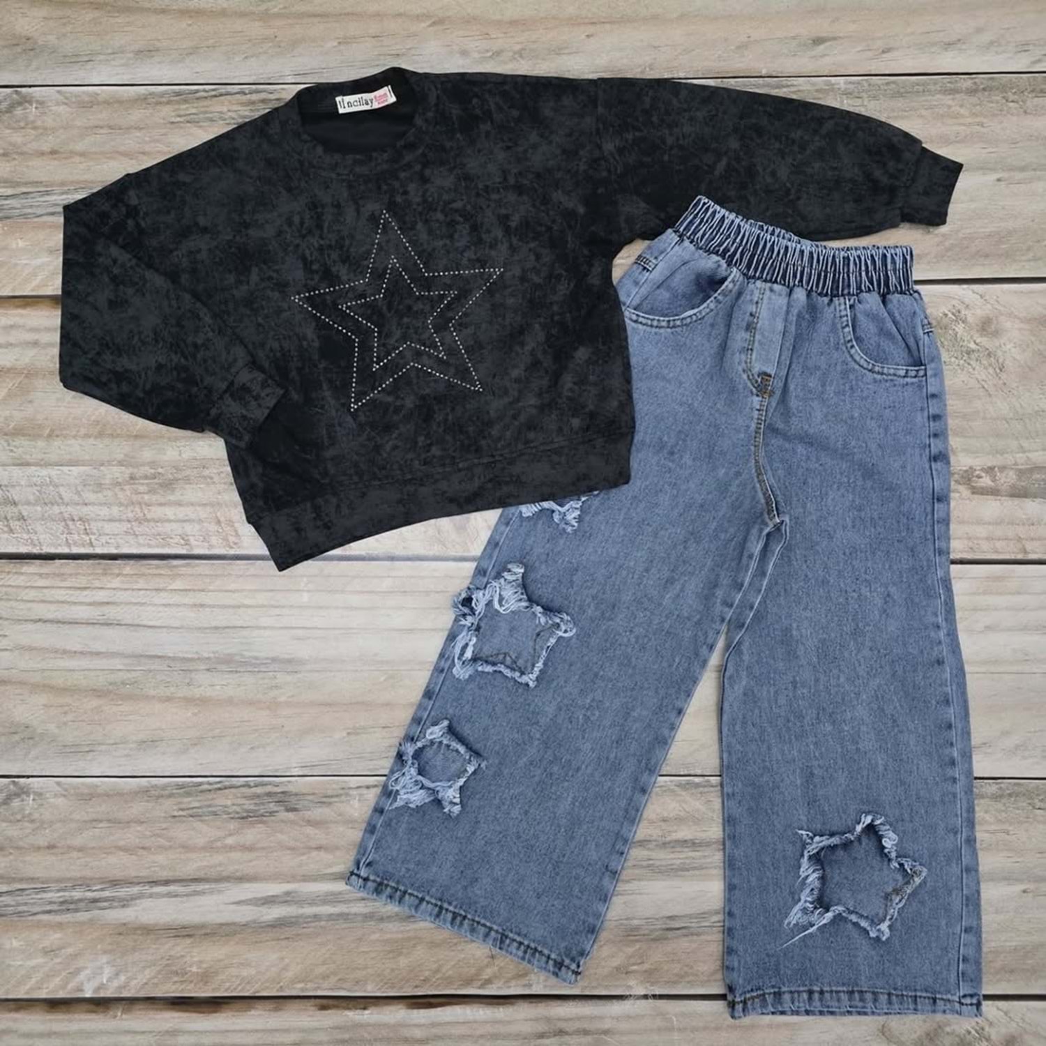 (6-10) Yaş İNCİLAY YILDIZ DESENLİ KOT TAKIM - SİYAH - 7 YAŞ