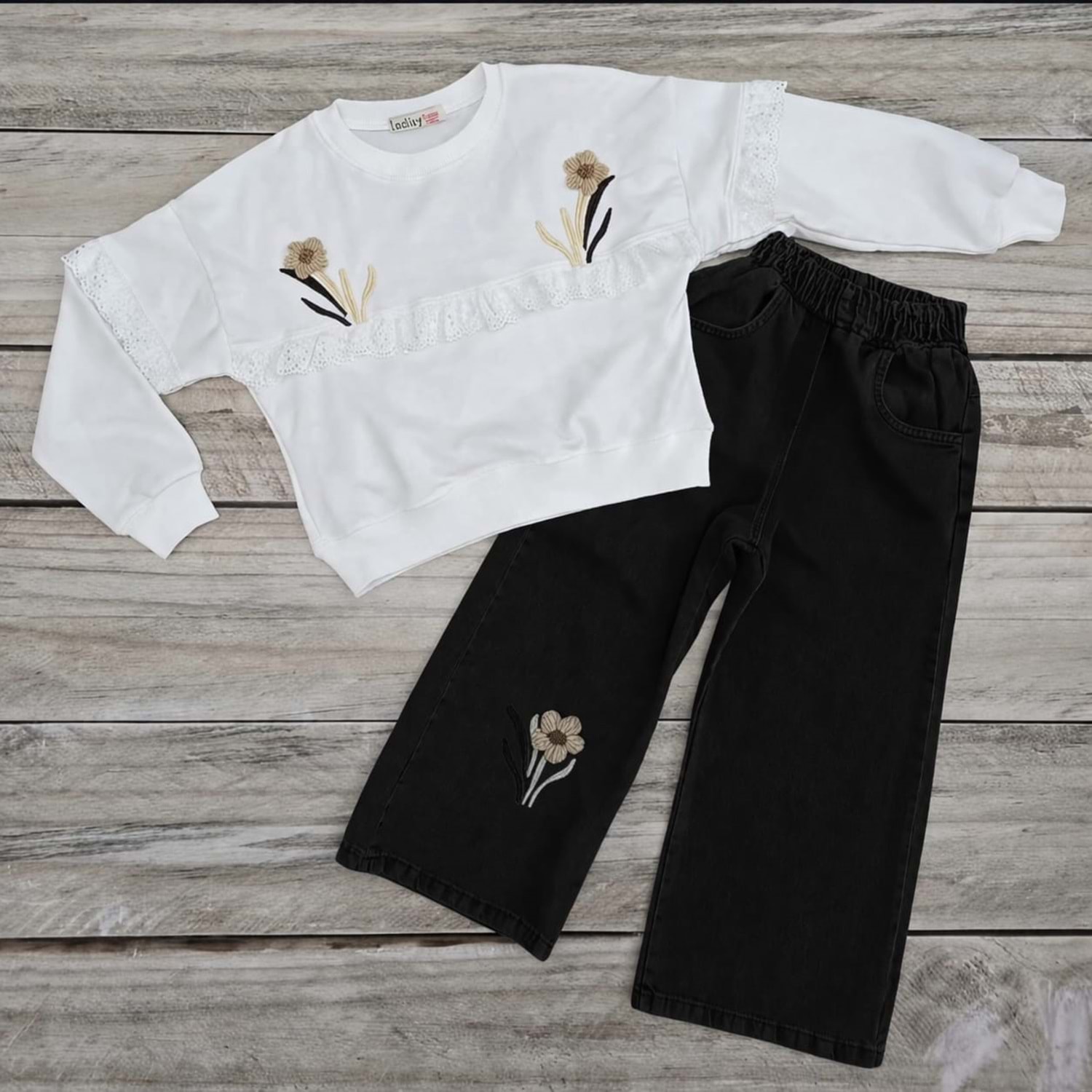 (6-8) Yaş İNCİLAY ALT ÇİÇEKLİ KOT TAKIM - SİYAH - 6 YAŞ