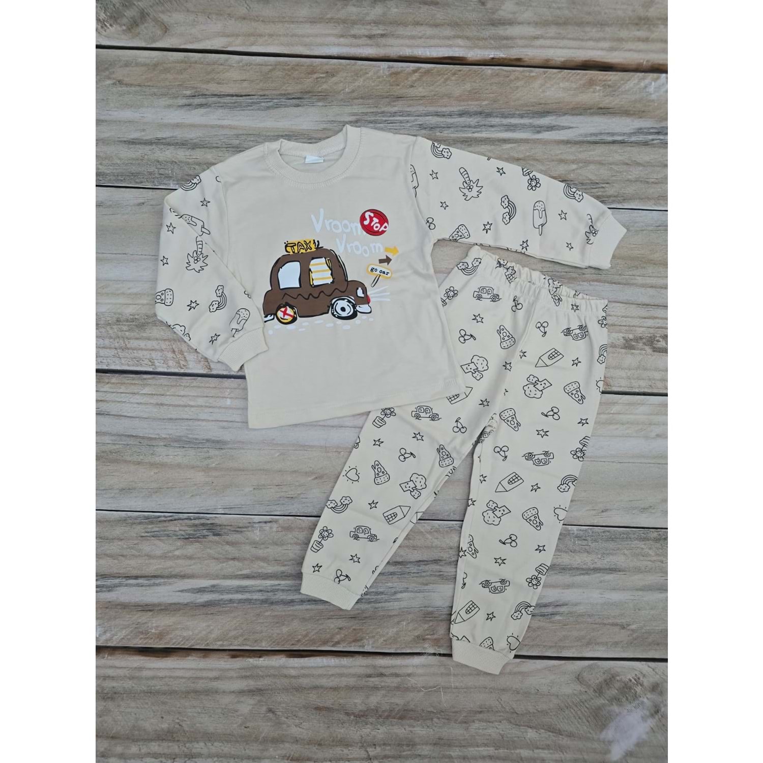 ARABA DESENLİ MEVSİMLİK PİJAMA TAKIMI - KREM - 5 YAŞ