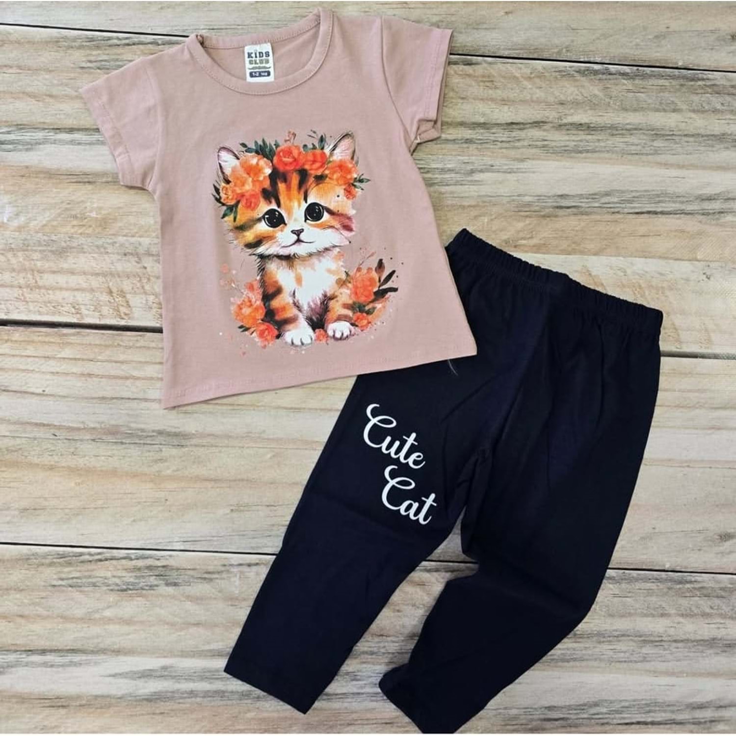 (1-2-3) Yaş MEMOCAN KEDİ BASKILI TAYTLI TAKIM - KAHVERENGİ - 1-2 YAŞ