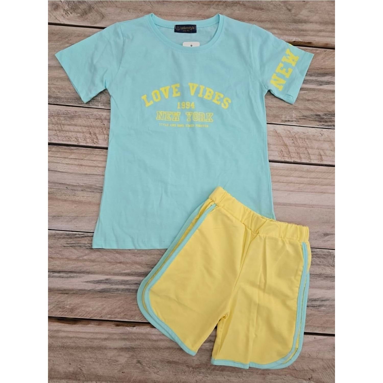 (9-12) Yaş ŞEKER STYLE LOVE VIBES BASKILI ŞORTLU TAKIM - SU YEŞİLİ - 11 YAŞ